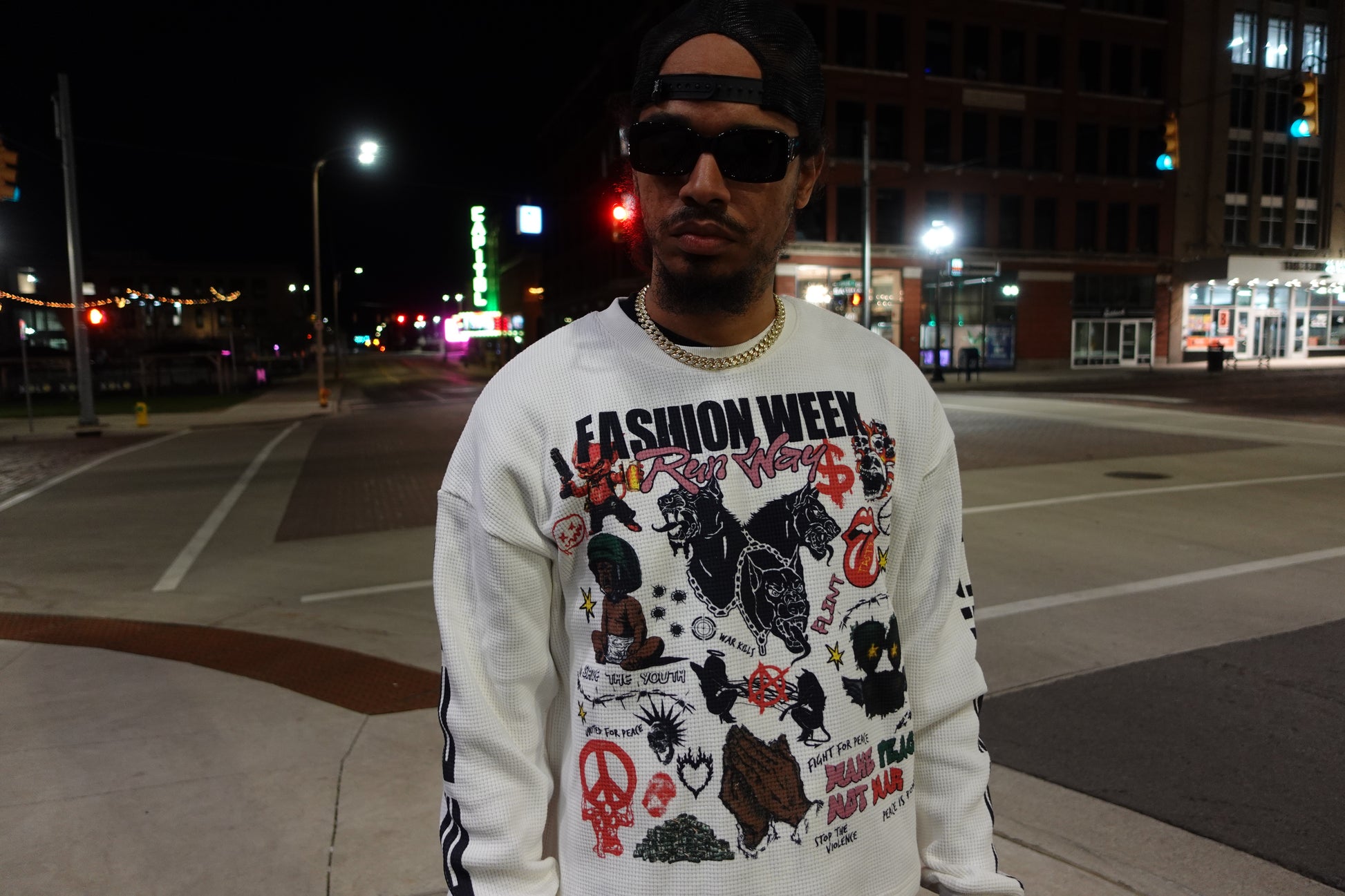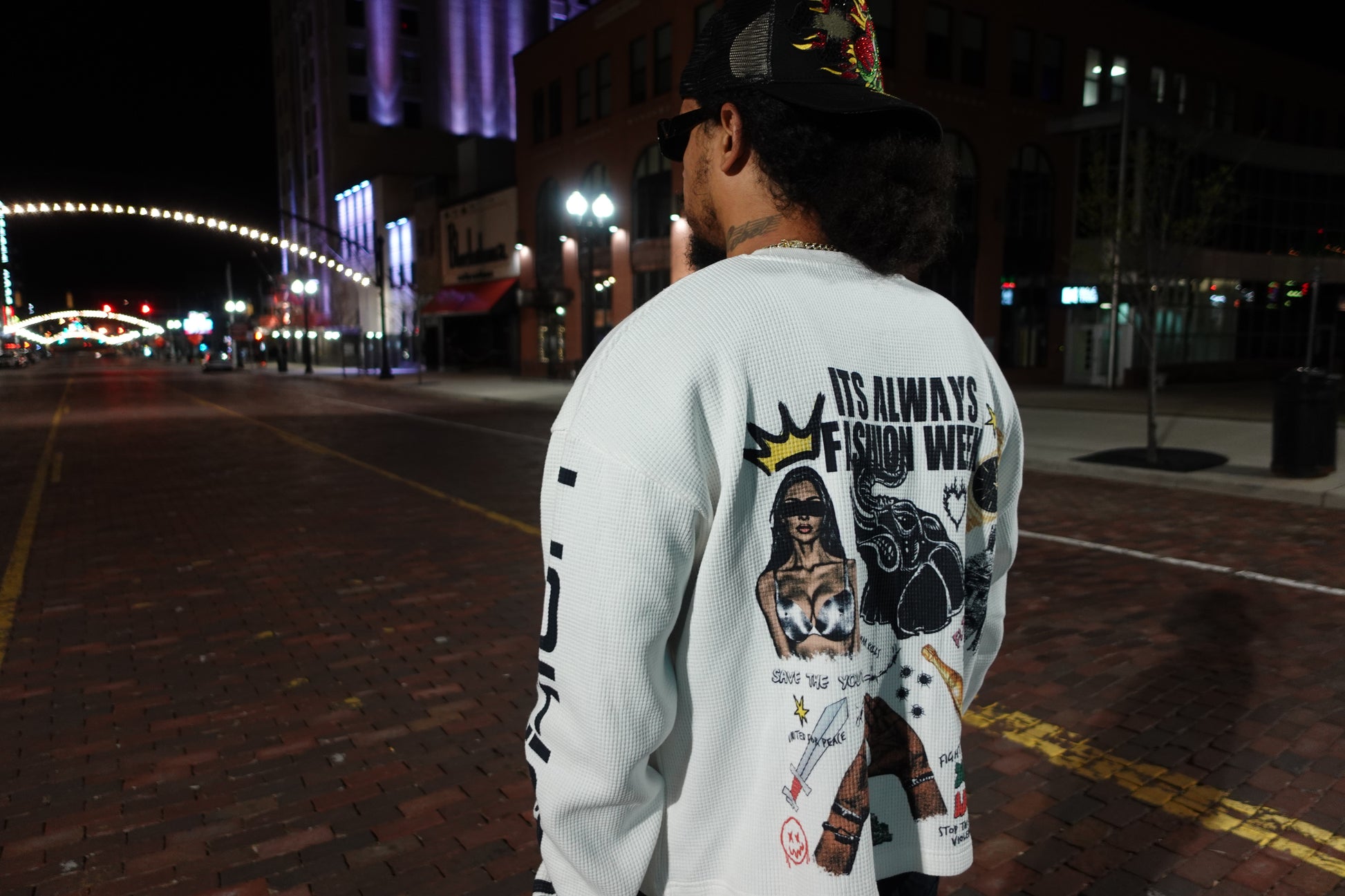 The Secret Society Thermal is a high-quality, thick, and cozy piece—perfect for staying warm on chilly nights. Designed with a cropped, waist-length cut and an oversized fit, it delivers a relaxed, baggy silhouette. If you're over 6'0", we recommend sizing up to a Large or above for the best fit. The model is 6'1", 160 lbs, and wearing a size Large.